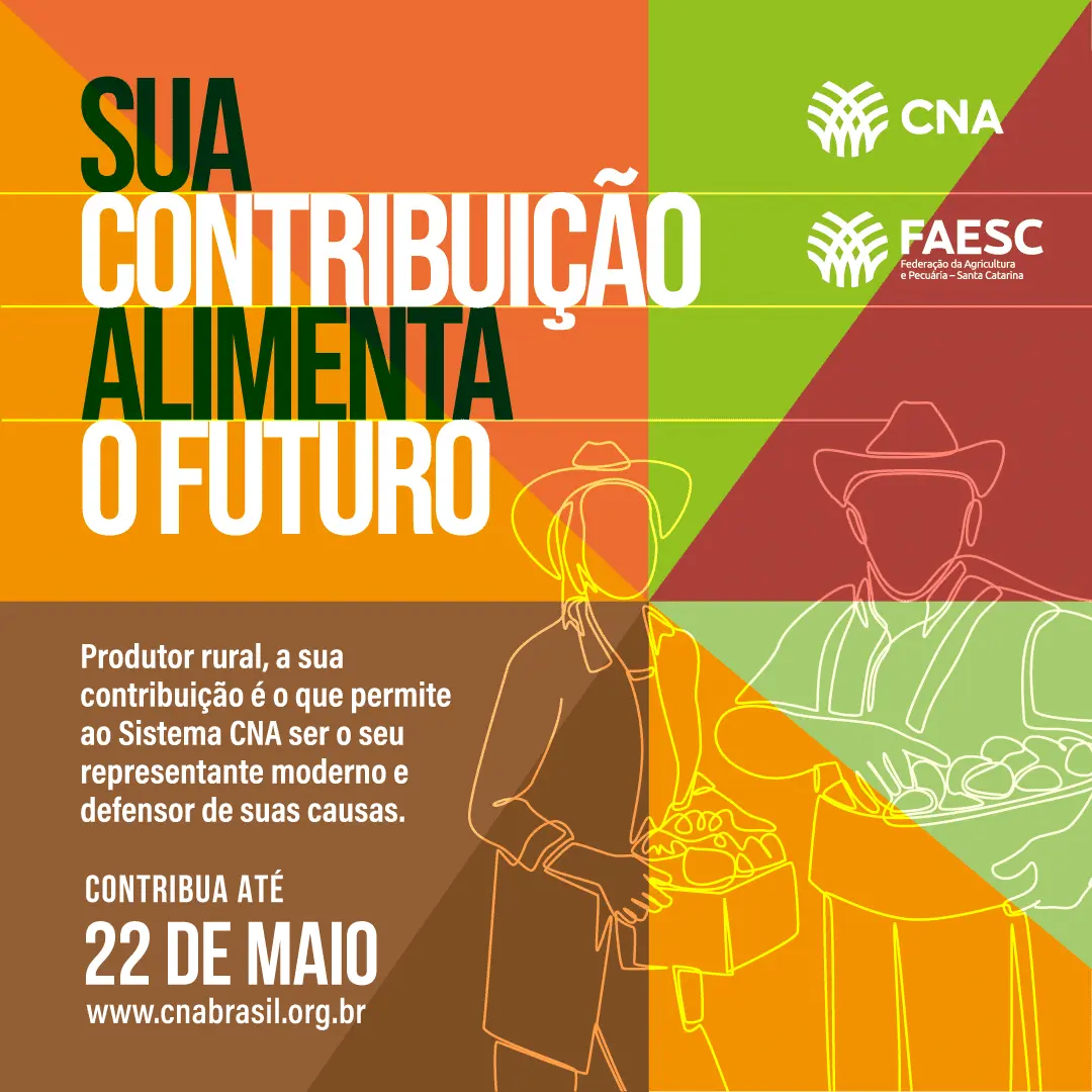 “É importante esclarecer que contribuição é fundamental para a conquista dos direitos, interesses e reivindicações, independentemente do ramo de atividade ou do tamanho do estabelecimento rural”. Para fazer o pagamento da contribuição, o produtor rural recebe da CNA uma guia bancária, já preenchida, com o valor da CSR. Caso não receber, a segunda via do boleto em Santa Catarina pode solicitada à Faesc pelo telefone (48) 3331-9700.