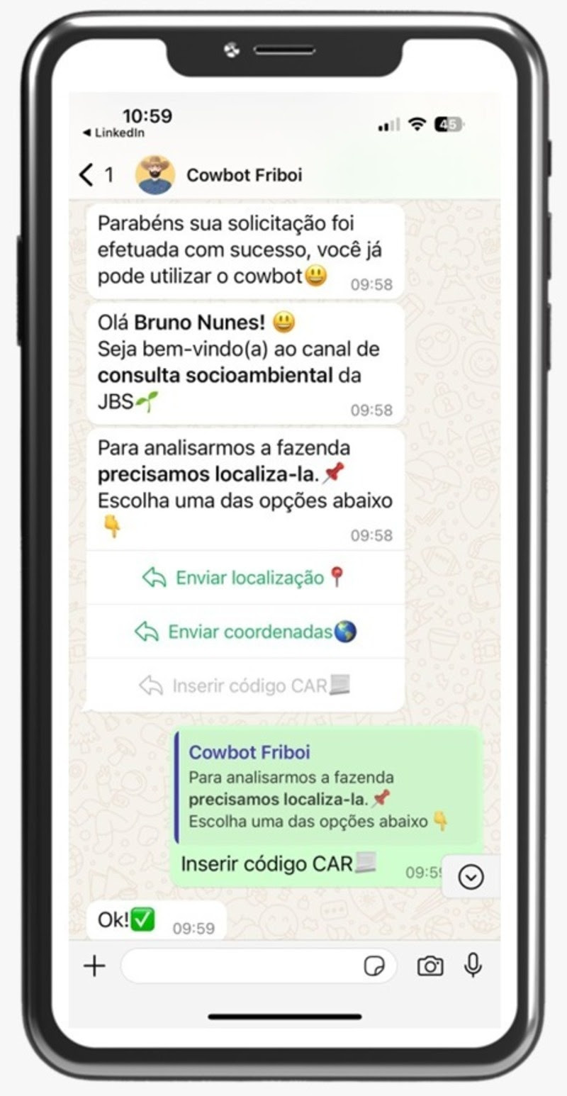 Lançado há um ano, o ‘Cowbot’, ferramenta da JBS para consultas gratuitas, via WhatsApp, sobre a situação socioambiental de propriedades rurais da cadeia de fornecimento dos pecuaristas, já realizou mais de 30 mil análises no período. Com média de 92 consultas por dia útil, o ‘Cowbot’ se consolida como aliado dos pecuaristas na gestão socioambiental da cadeia de fornecimento, fortalecendo a rastreabilidade e a sustentabilidade na pecuária brasileira.