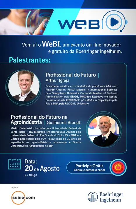 Agosto de 2020 – A Boehringer Ingelheim Saúde Animal e a Suino.com realizarão em parceria o WeBI, um fórum totalmente gratuito com foco no profissional do futuro e no futuro das profissões relacionadas ao agronegócio brasileiro. O evento será no dia 20 de agosto, às 18h30, no Canal Suíno no YouTube. Para acompanhar gratuitamente, basta se inscrever no canal.