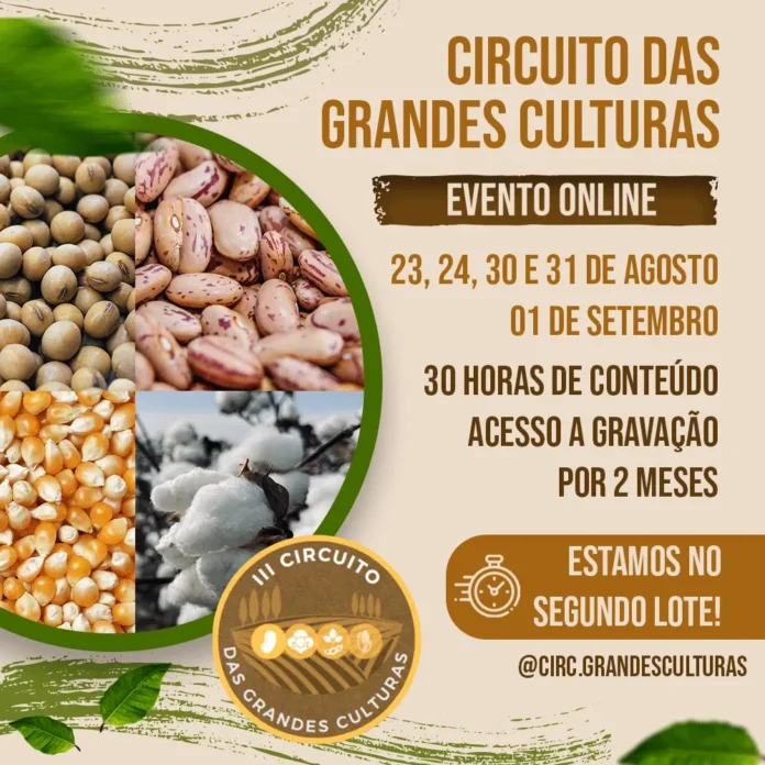 O evento ocorrerá nos dias 23,24,30 e 31 de agosto e dia 01 de setembro de 2022 das 14h às 20h, no formato on-line, e apresentará ao público os manejos para a máxima produção das culturas de soja, milho, feijão e algodão.