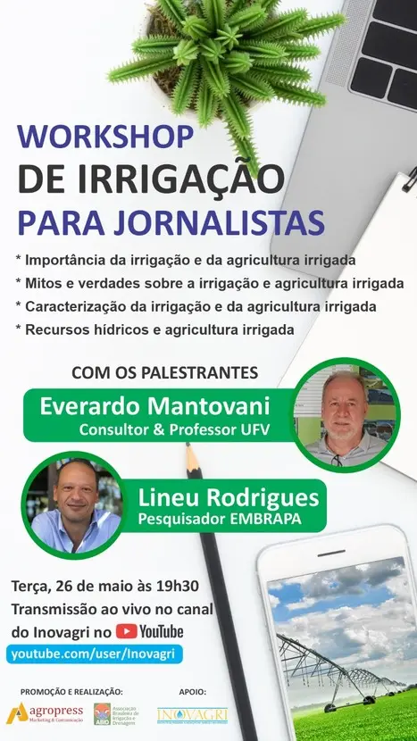 Pensando nesta questão a Associação Brasileira de Irrigação e Drenagem, ABID, e a Agropress Marketing e Comunicação, organizaram o Workshop de Irrigação para Jornalistas, que vai acontecer no dia 26 de maio, 19h30, via canal do youtube do Inovagri – youtube.com/user/inovagri. Importância da irrigação e da agricultura irrigada, mitos e verdades sobre a irrigação e agricultura irrigada e caracterização da irrigação e da agricultura irrigada, são alguns dos temas a serem tratados no evento.
