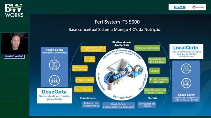 “A agricultura precisa usar fertilizantes para nutrir as plantas. Com isso, um dos processos mais importantes é a operação de plantio, que é cirúrgica e determinante nos resultados”, afirmou Evandro Martins, presidente da FertiSystem, durante o BW Works SENAI – Empresas Inovadoras, que trouxe o tema Sustentabilidade Transformacional na Aplicação de Fertilizantes a Taxas Variáveis nas Linhas de Plantio, no dia 17 de maio, com apresentação de Luís Gustavo Delmont, especialista em desenvolvimento industrial no SENAI Nacional.